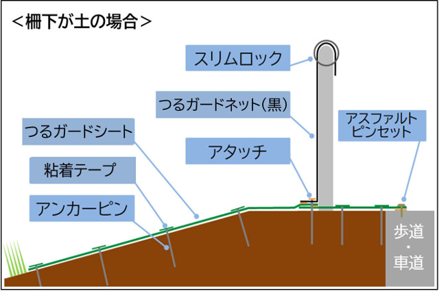 ネットの裾を防草シートの下に潜り込ませることで、ネット下までつるが達した場合にも、歩道側につるが這い出ることはありません。